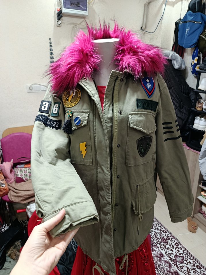 Rock punk tarzı pembe kürklü yakaya sahip, hafif kamuflaj desenli, uzun kollu, bol kesim midi uzunlukta kadın ceket. Yumuşak ve sıcak kumaştan üretilmiştir.