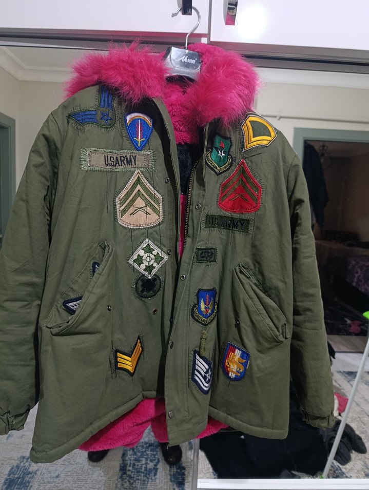 Kadın ceketi, pembe kürklü kapüşon, kamuflaj desen ve askeri tarz yamalarla dikkat çeker. Gevşek kesim, normal midi boy ve strappy kollara sahiptir. Yumuşak ve sıcak kumaştan üretilmiştir.