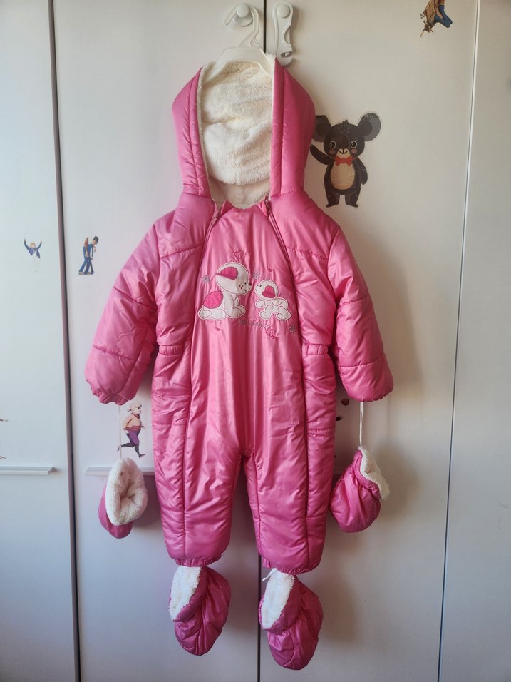.Pastel pembe renkli, kapüşonlu ve kürklü bebek tulumu. Nakış detaylı, eldiven ve patik ile tamamlanmıştır. ❄️