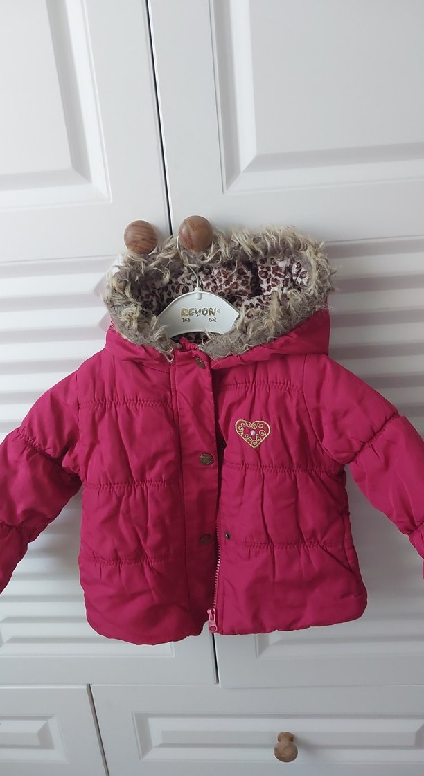 Pembe, kapüşonlu ve kürk detaylı kız montu, yumuşak ve sıcak kumaştan. Göğüs kısmında kalp desenli, içi renkli baskılıdır.