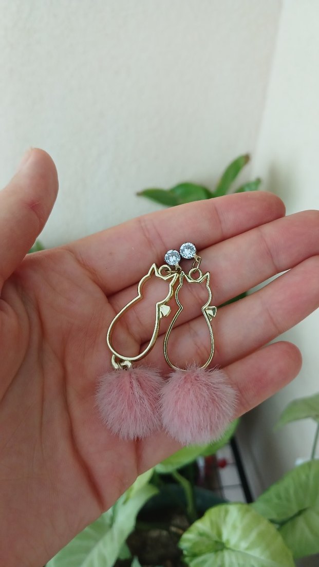 Pembe Kürklü Kedi Figürlü Midi Küpe