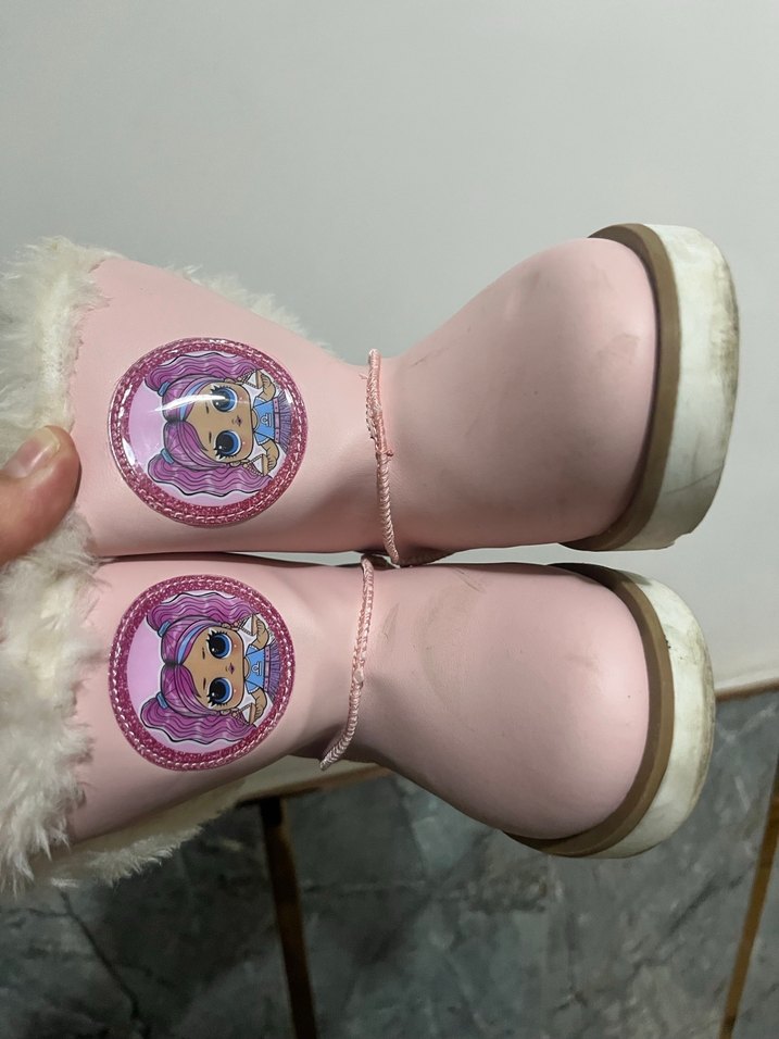 Pastel pembe kauçuk botlar, kürk detaylı ve baskılı desenli, trend takipçileri için uygun.