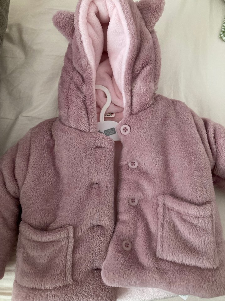 Yumuşak pembe polar kumaş, kürklü detaylar ve kesik yaka ile bol kesim kız çocuk ceketi. Düz, normcore tarzında, ön cepler ve düğmeli kapanışlı hiç giyilmemiştir