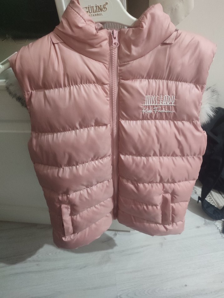 Kız çocukları için pastel pembe renkte, kürklü detaylı, kolsuz, yüksek yakalı ve dar kesim yelek. Yumuşak ve sıcak kumaştan üretilmiştir.