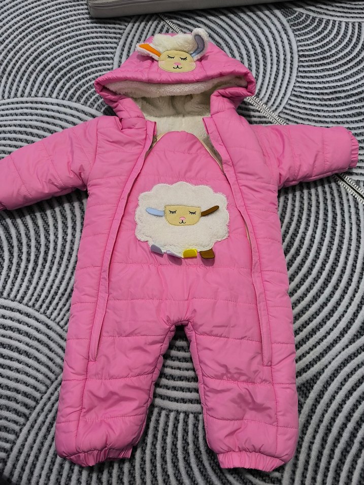 Pembe renkte, kürklü kapüşonlu ve renkli nakış detaylı bebek kız tulumu. Notched lapel yaka tasarımı ile sıcak tutar.