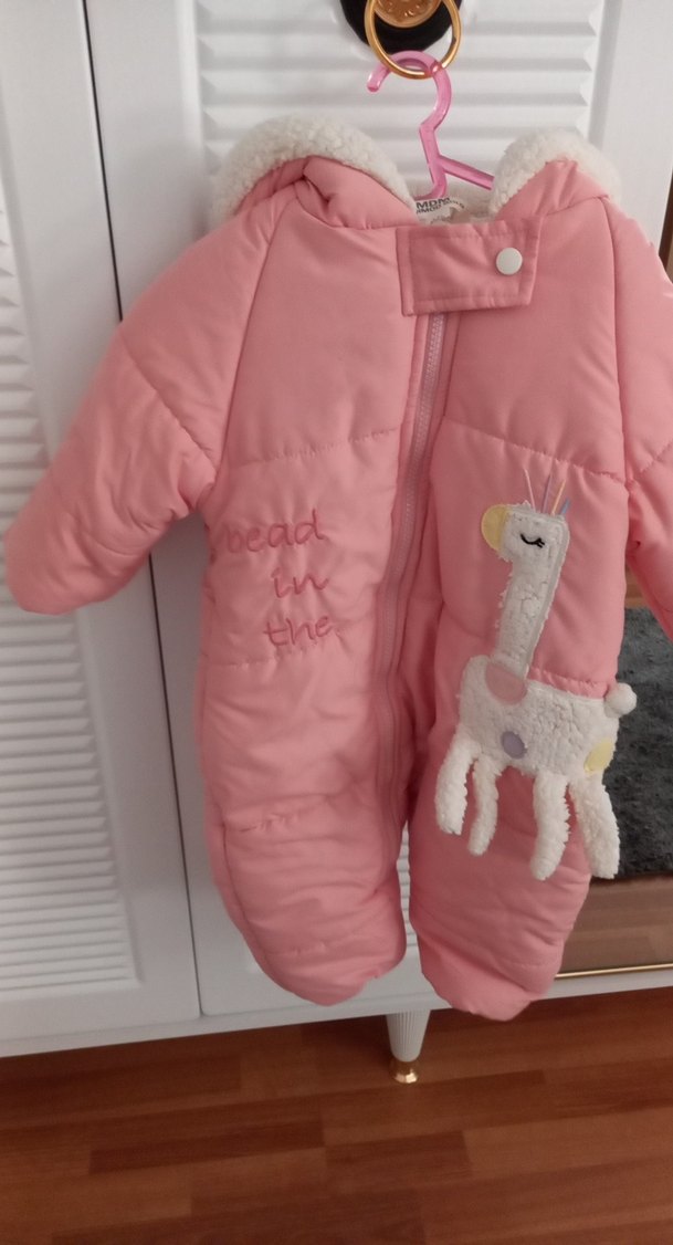 Pastel pembe renkte, kürklü detaylı ve nakışlı bebek kız tulumu, yakasında çentikli yaka bulunur.