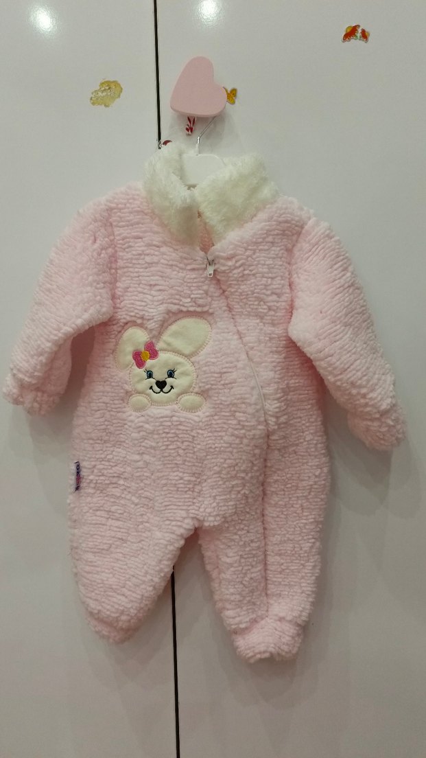 Pastel pembe renkte, kürklü yakalı ve tavşan nakışlı bebek tulumu. Notch yakalı, sıcak ve rahat tutar. ❄️