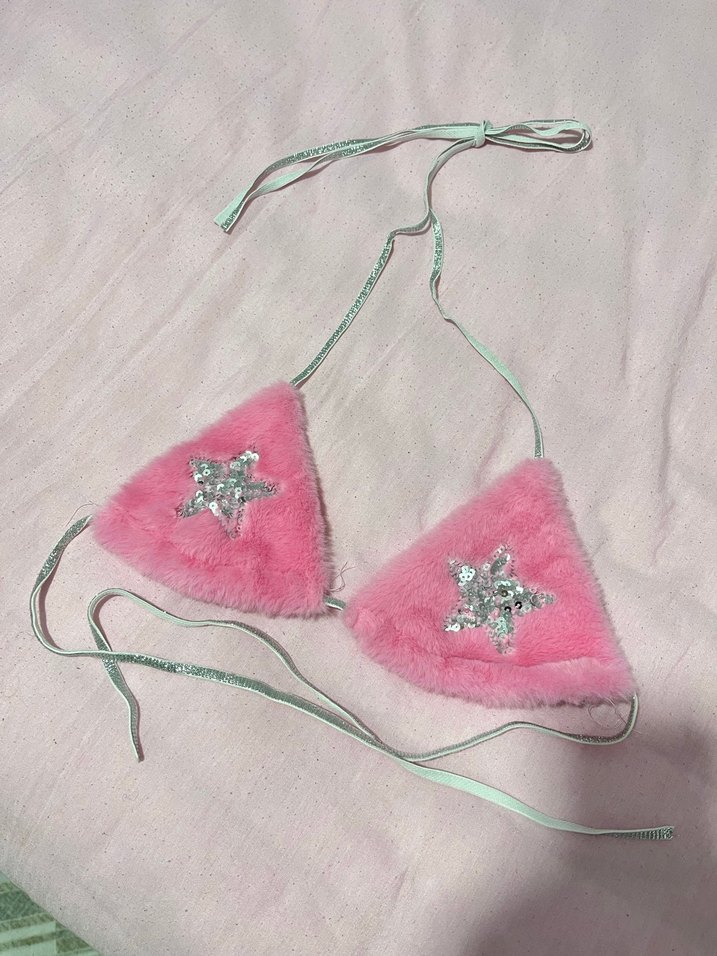 Pembe renkli, kürklü ve nakışlı yıldız desenli bikini üstü. İnce askılı ve vücuda oturan kesimde, parti için uygun.