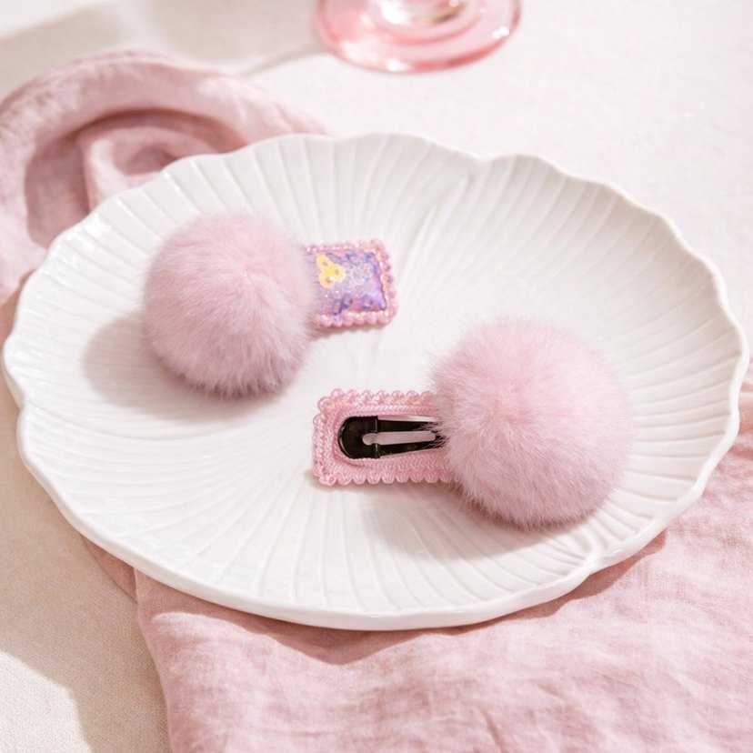 Pastel pembe renkte, yumuşak kürk detaylı ve nakışlı desenlere sahip çocuk saç tokası seti, modaya uygun ve avangart tarzda. Renk belirtin