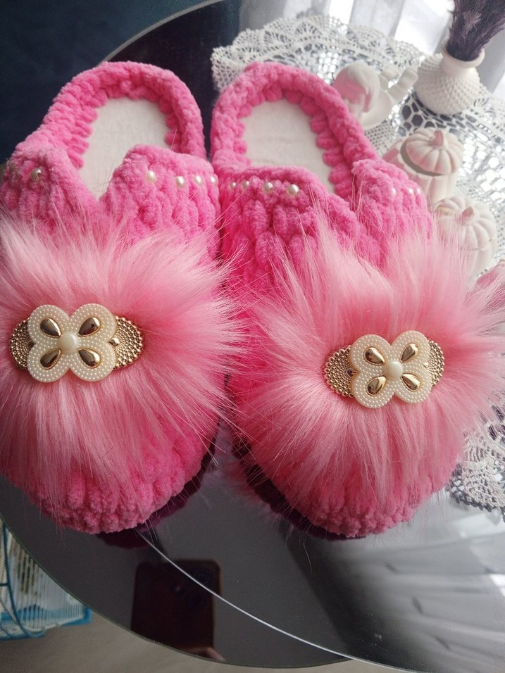 Pembe renkli, kürklü detaylar ve nakışlı desenlere sahip triko kadın terlikler, renkli ve rahat bir kullanım sunar. Günlük kullanım için yüksek topuklu tasarım içerir.