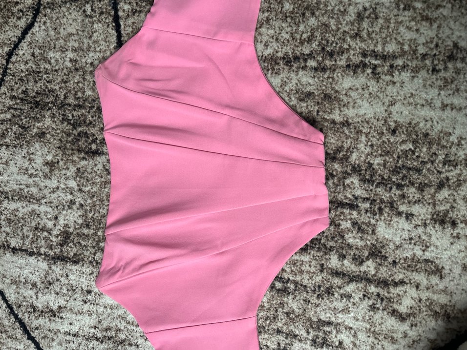 Pembe renkli, sentetik kumaştan üretilmiş, kürk detaylı straplez ve fitted kesim kadın büstiyer. Normal midi boyda, desen içermeyen tasarım sokak modası ve dış mekan kullanımı için uygundur.