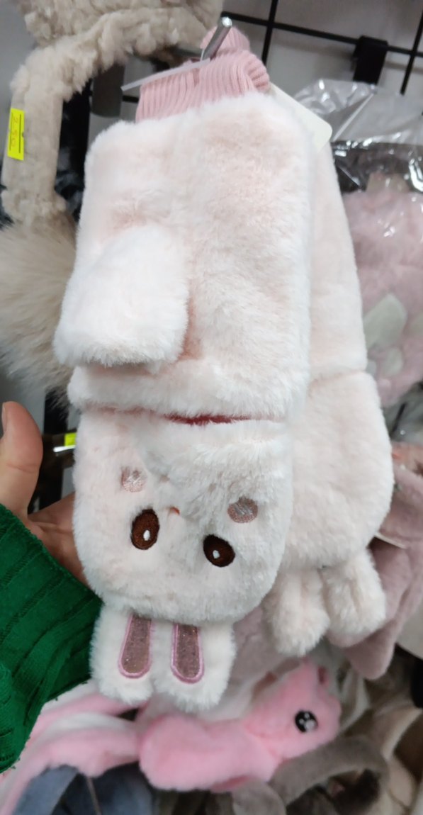 Pastel pembe renkte, yumuşak kürk görünümlü kumaştan yapılmış, nakışlı tavşan detaylı çocuk atkısıdır.