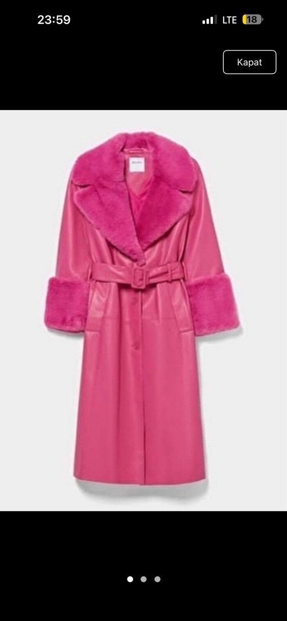 Pembe renkte, yakası ve kolları kürklü uzun kadın kaban. Bağlamalı beli ve notlu yaka tasarımıyla, yumuşak ve sıcak kumaştan üretilmiştir. Ofis için uygun, Paris tarzı sokak giyimi öğeleriyle.