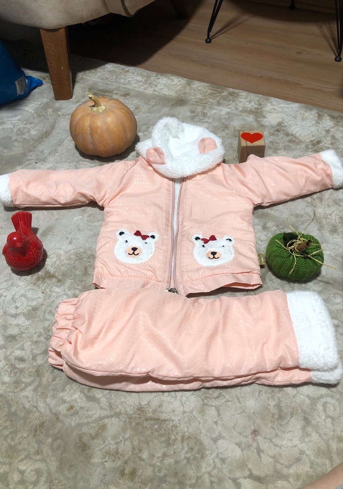 Uzun kollu, pastel pembe renkli bebek kız takımı, kürk detaylı manşet ve kapüşon içerir. Ceket ceplerinde işleme ayı yüzleri bulunur.