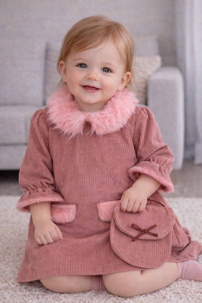 Gül kurusu renkli ince kadife kumaştan üretilmiş , uzun kollu, kürk detaylı yakası ve cepli kız bebek elbisesi . %80 PAMUK %20 POLYESTER 9-12 Aylar mevcuttur.