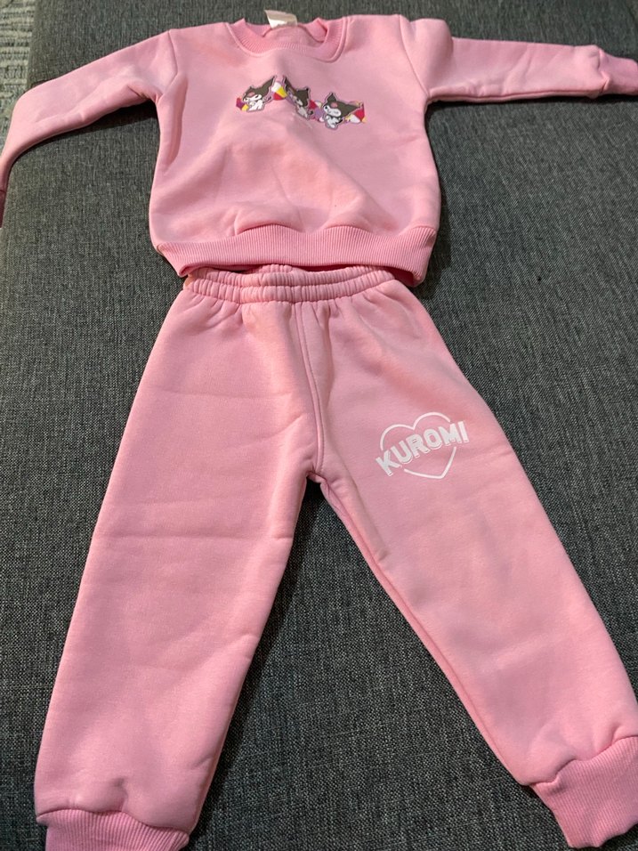 Pembe, bol kesim kız eşofman takımı, uzun kollu ve yuvarlak yakalı. Kuromi baskılı, yumuşak örme dokulu rahat kumaş içerir. Sıfır üründür içi pamuklu