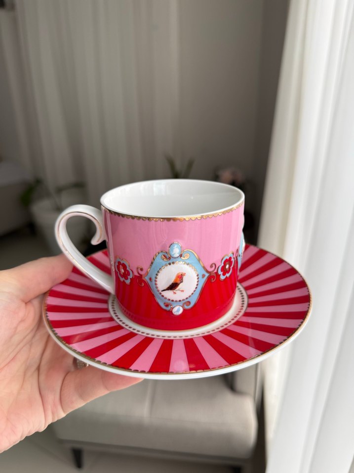 Pastel pembe renkte, kuş desenli ve altın detaylı fincan ve tabak seti. Çay veya kahve için uygundur. ☕️ Pip stüdyo çay fincanı tekli fiyattır
