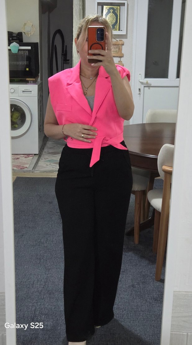 Düzenli kesim, normal midi boyda, pembe kuşaklı kadın kumaş pantolon. Ofis ve iş ortamı için uygun, yumuşak ve parlak kumaştan yapılmıştır.