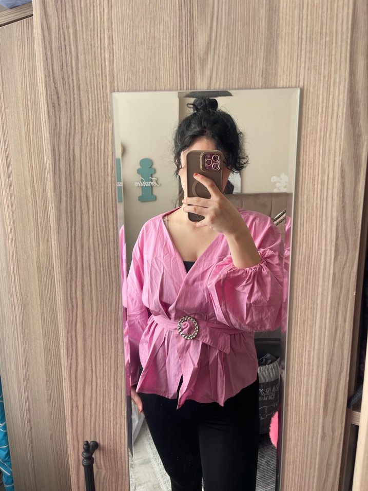 Pembe Kuşaklı V Yaka Kadın Gömlek