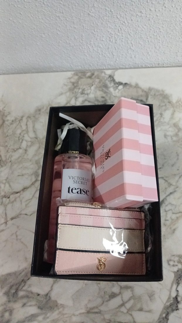 Pembe kutulu Kadın Cüzdan & Victoria"s secret vücut losyonu