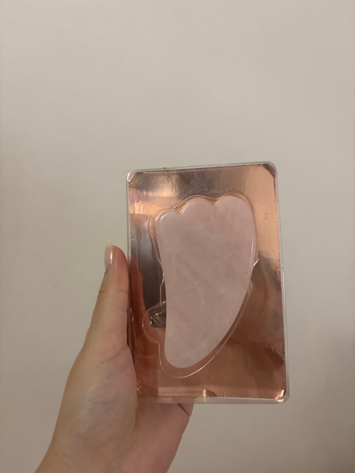 Pembe kuvarstan yapılmış gua sha yüz masaj taşı, cilt bakımı ve rahatlama için kullanılır.