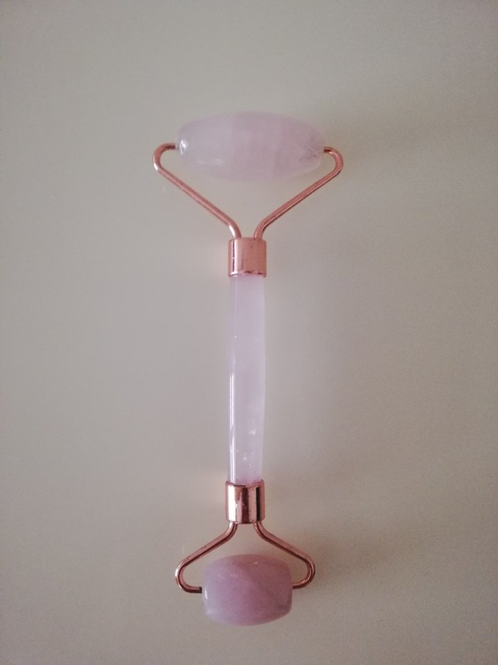 Doğal pembe kuvars taşından yapılmış, cilt masajı için kullanılan metal çerçeveli yüz masaj aleti #masaj #kuvars