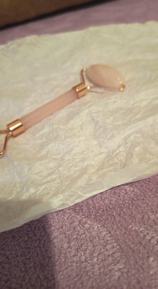 Pembe kuvars taş başlıklı, altın detaylı yüz masaj aleti, cilt görünümünü desteklemek için kullanılır.