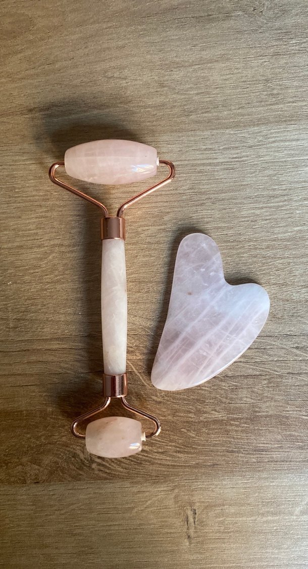 Pembe kuvars yüz masaj aleti ve gua sha taşı içeren set, cilt bakımına nazik masajla destek olur.