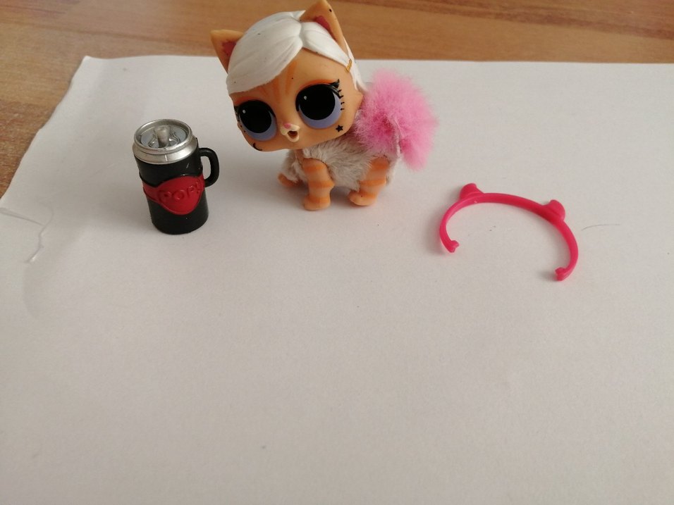 Büyük gözlü, beyaz saçlı ve pembe tüylü kuyruğa sahip pastel turuncu oyuncak kedi lol bebek. Siyah şişe ve pembe taç ile birlikte.