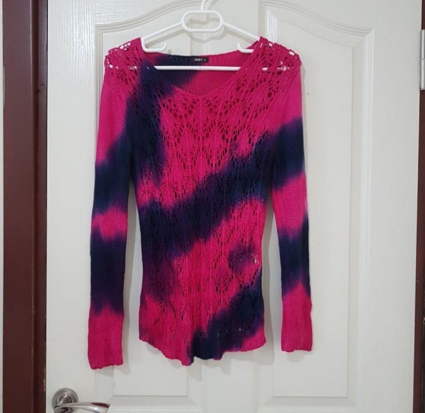 Kadınlar için pembe-lacivert batik desenli, V yakalı, uzun kollu, bol kesim midi uzunluğunda triko kazak. Grunge punk ve gotik tarzda, örme kumaştan.