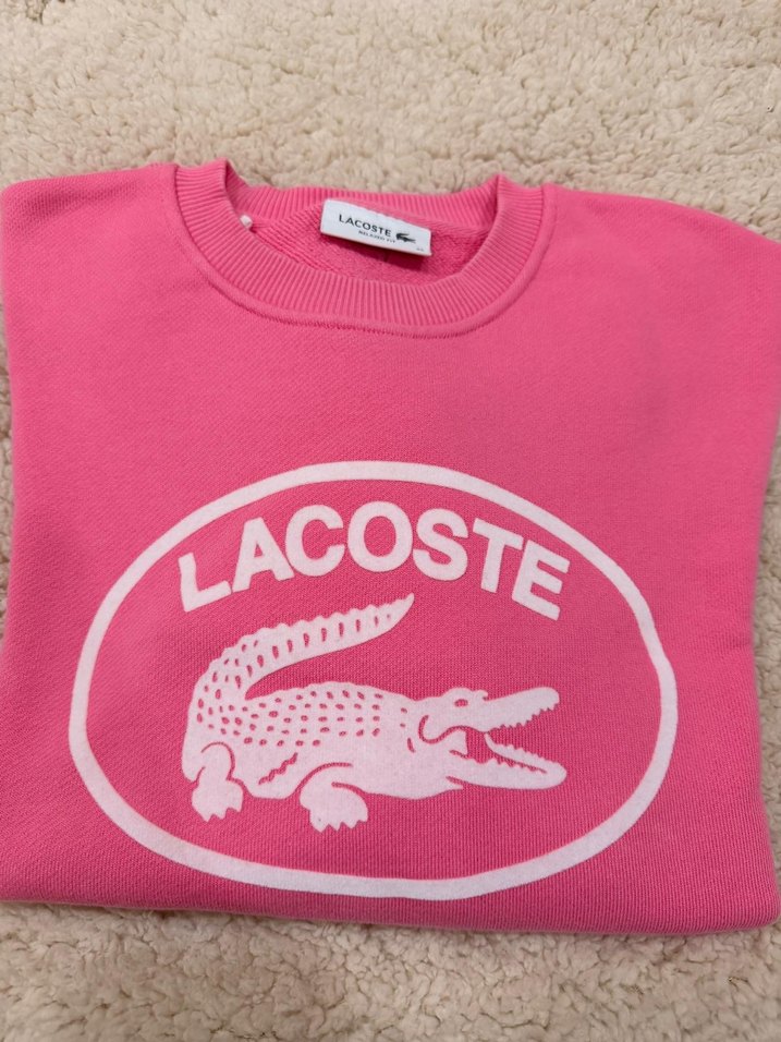 Pembe renkli sweatshirtü yuvarlak yaka ve uzun kolludur. Yumuşak ve sıcak dokulu, bol kesim ve baskılı Lacoste logosu içerir.