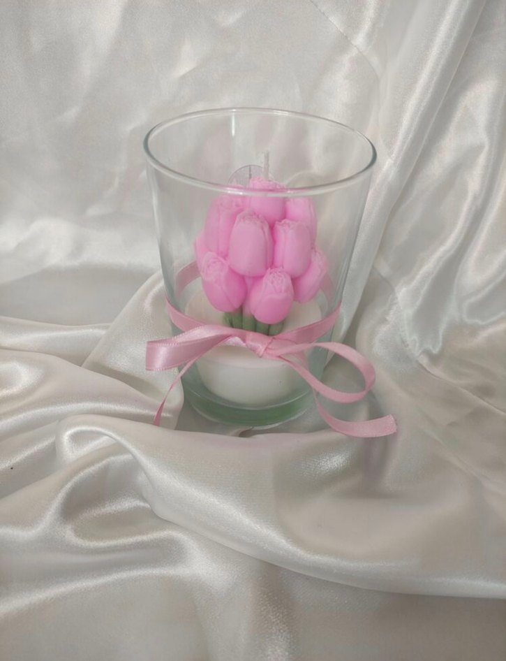 Pastel pembe laleler şeklinde mum, şeffaf cam kabın içinde ve etrafında pembe kurdele ile süslenmiş. Dekoratif kullanım için uygun. ️