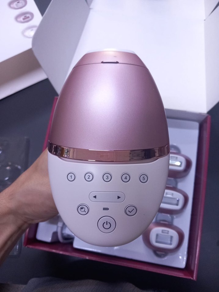 Pembe lazer epilasyon cihazı, beş güç seviyesi ve kolay kullanım için net dijital ekran sunar. Şık tasarımıyla etkili tüy azaltma sağlar.