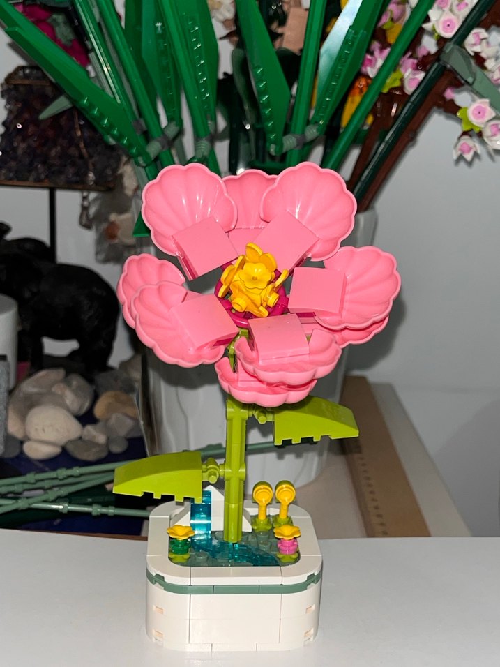 Renkli pembe Lego çiçek, yaprak ve taç yaprak detaylarıyla beyaz taban üzerinde küçük süslemeler içerir.