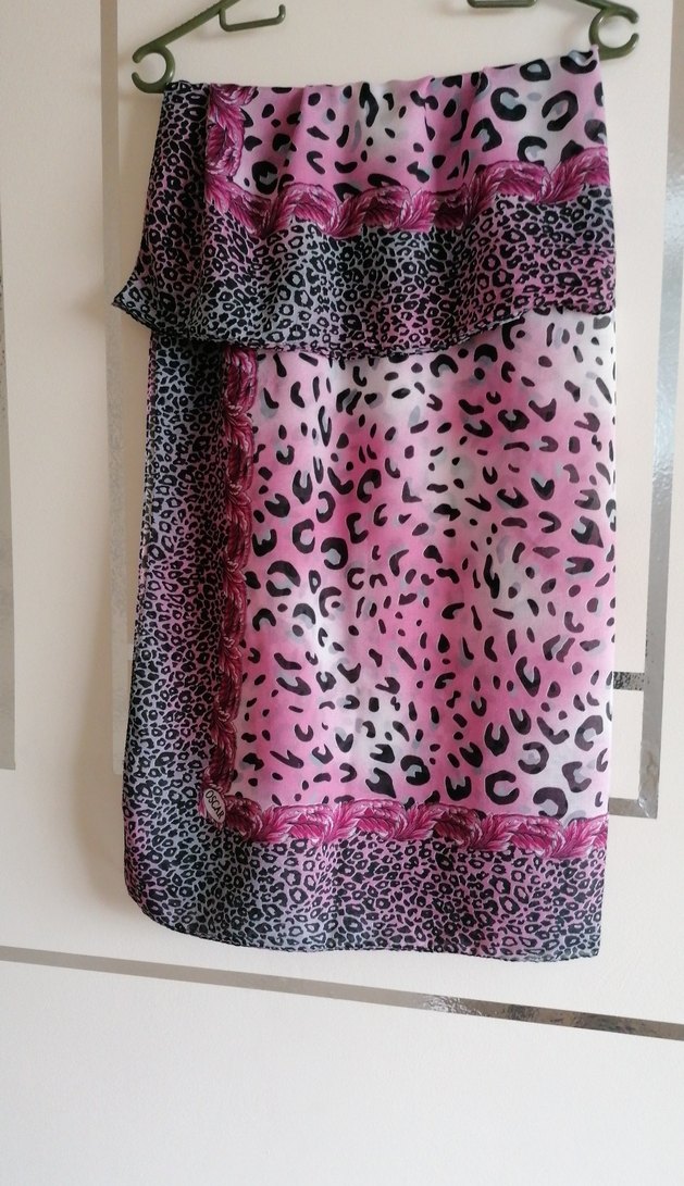 Yumuşak sentetik kumaştan yapılmış, pembe leopar desenli, drapeli renkli bohem bayan fular yemeni hayırlı olsun kare boy 92 cm