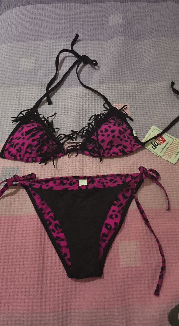 Dagi marka etiketli Fitted pembe leopar desenli bikini, ince askı detaylarıyla dikkat çeker. Alt kısmı siyah ipleri pembe