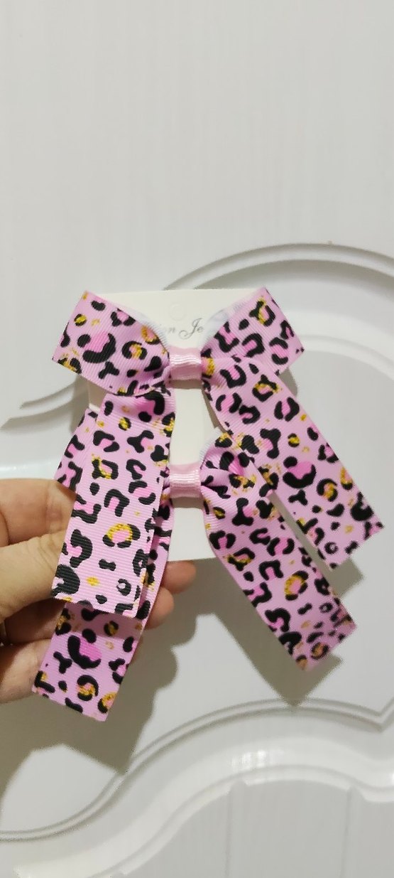 Renkli leopar desenli ve fiyonk detaylı pembe saç tokaları, cesur sokak stili için uygun.