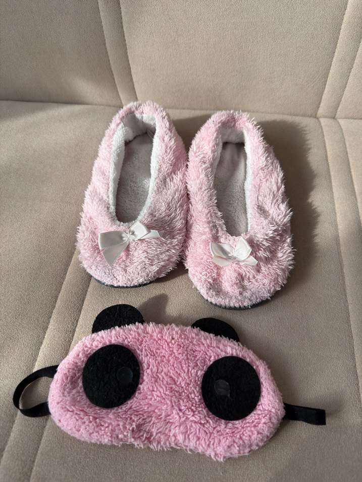 Pembe leopar desenli, kürklü kız ev terliği ve uyku maskesi seti. Yumuşak ve rahat, günlük kullanım için uygundur.