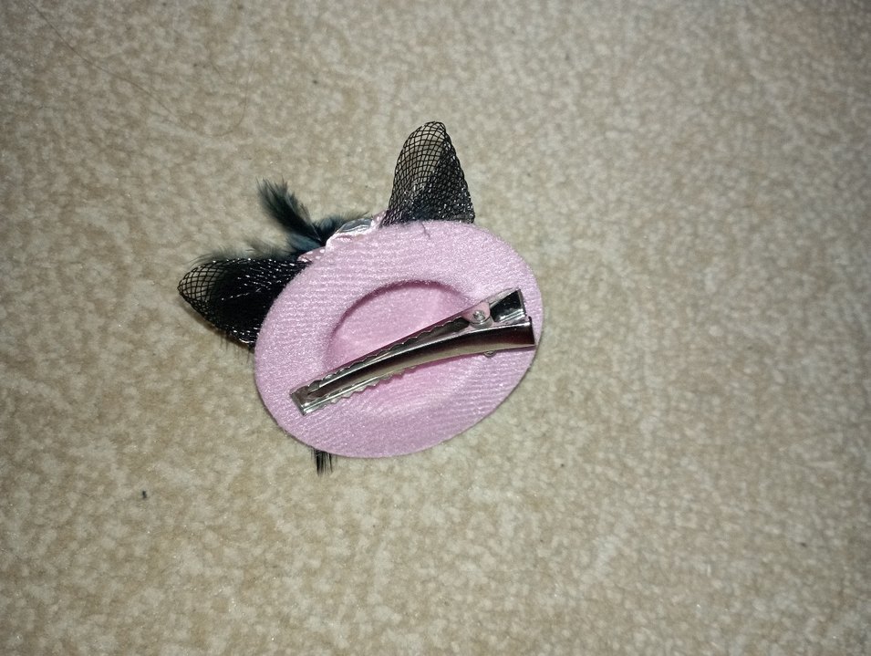 Pembe renkte, kürklü ve pastel leopar desenli çocuk saç tokası, siyah tül ve tüy detaylarıyla gotik tarzda.