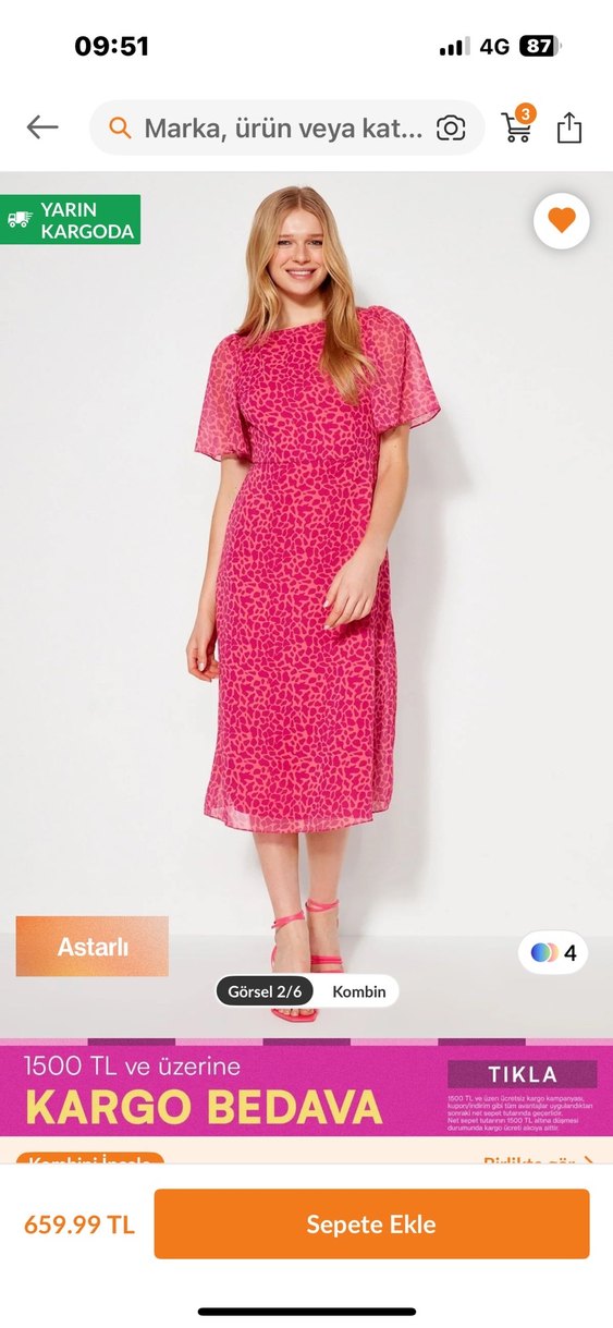 Pembe renkli, leopar desenli midi elbise, bol kesim, kısa kollu ve V yakalıdır. Sadece bir defa giydim alttan biraz kesildi.