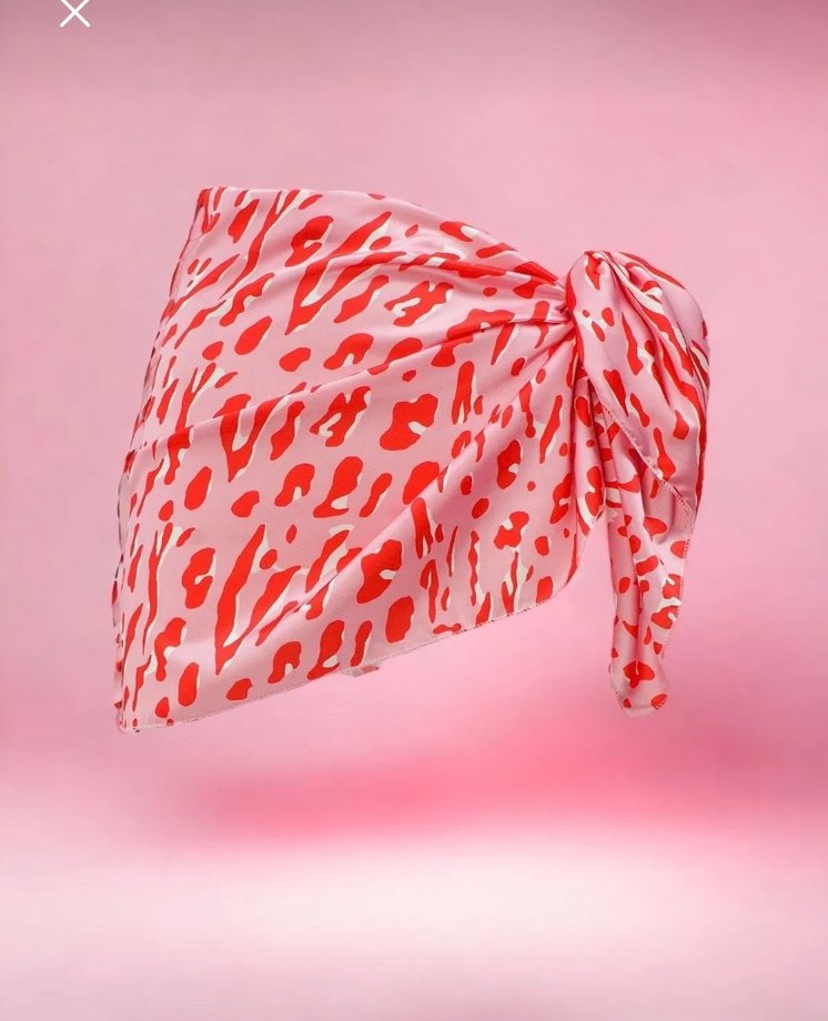 Pembe leopar desenli, drapeli ve bol kesim midi pareo. İnce askılı ve rahat kullanımlı, dış mekan için uygun.