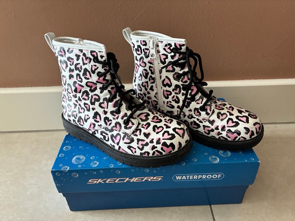 Pembe leopar desenli, siyah bağcıklı kız botu. Su geçirmez kauçuk malzemeden yapılmış. Sadece 1-2 kez giyilmistir. Tabanin temizliginden anlasilacagi uzere sorunsuzdur. 33,5 numaradir