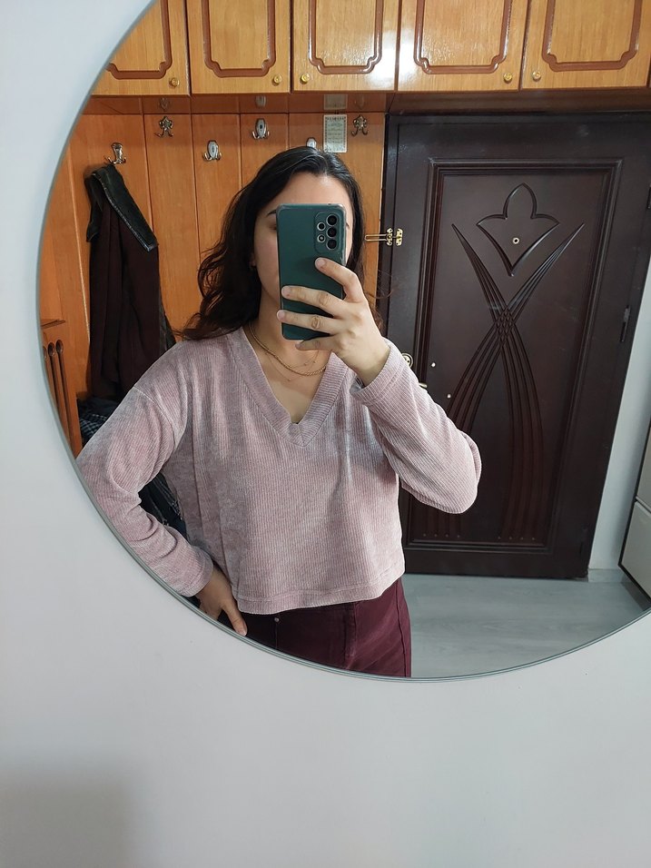 Pembe lira renkli, V yakalı ve uzun kollu kadın sweatshirtü, bol kesimi ve yumuşak dokusuyla rahat ve şık bir görünüm sunar. Günlük kullanım için uygundur. kadifemsi bir yapısı vardır