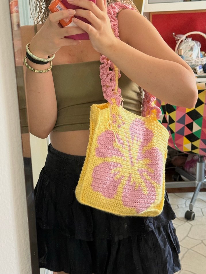 Sarı renkli, pembe çiçek desenli örgü çanta. Sipariş üzerine örüyorum ilanı satın almadan iletişime geçebilirsiniz.