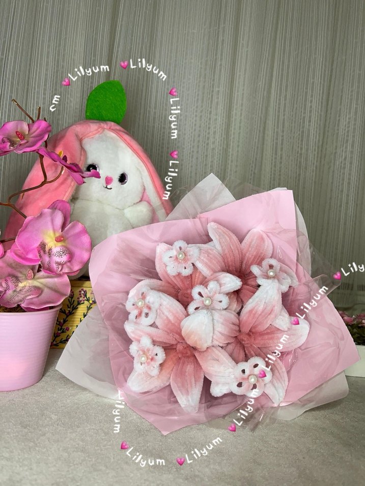 Bu lilyum tarzda buket, narin beyaz detaylarla süslenmiş yumuşak pembe çiçeklerden oluşur ve açık pembe kağıda sarılmıştır. Özel günler için harika bir fikir!