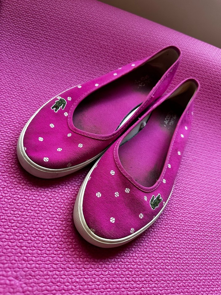 Pembe renkli, düğmeli ve renkli sokak stili kız loafer ayakkabılar. Beyaz küçük noktalar ve yeşil logo detaylıdır.