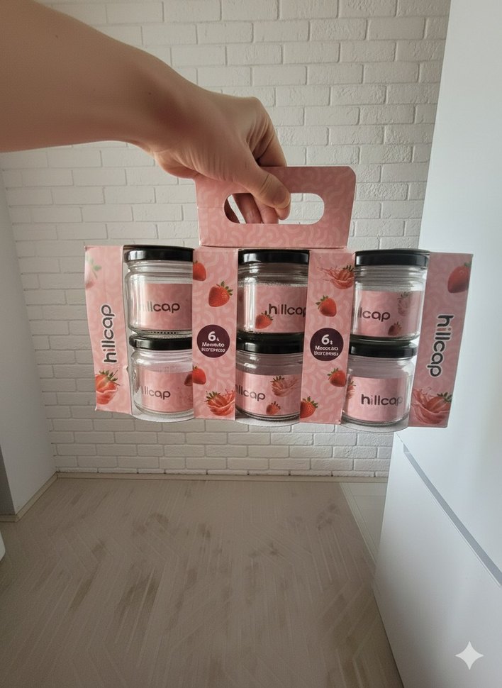 Altı adet siyah kapaklı, hafif pembe cam kavanozdan oluşan set. Çilek desenli etiketli, farklı mutfak malzemeleri için uygun.