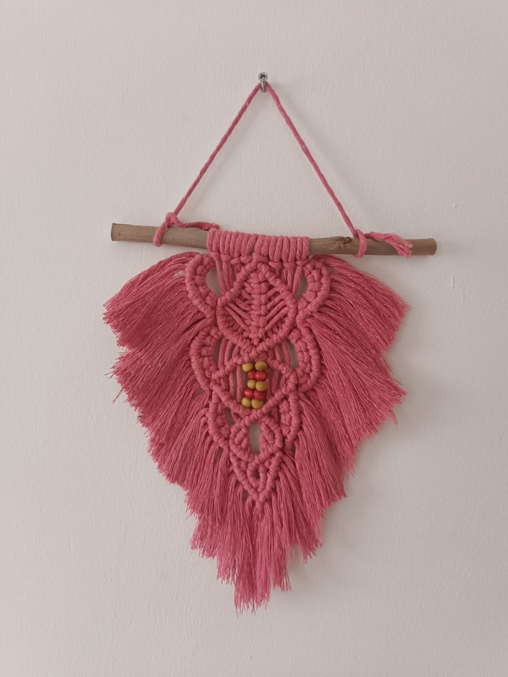 Pembe makrome duvar süsü, renkli boncuklar ve doğal ahşap çubuk ile el yapımı dokuma desene sahiptir. Her odaya canlılık katar.