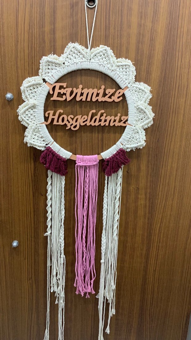 Pembe ve krem renklerde makrome duvar süsü, üzerinde "Evimize Hoşgeldiniz" yazısı bulunur. Dekoratif ve davetkar bir ürün.