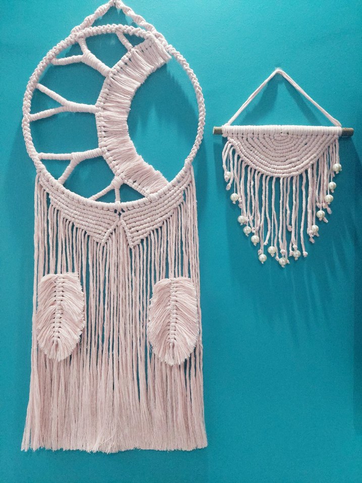 İki pastel pembe makrome duvar süsü, detaylı düğümler ve püsküllerle yumuşak bir dekoratif dokunuş sağlar.